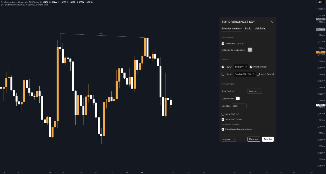 Líneas y etiquetas: Activar o desactivar divergencias SMT alcistas/bajistas y sus anotaciones.